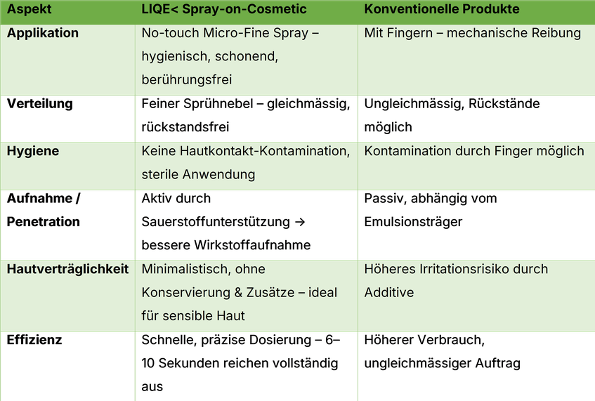 Im Gegensatz zu herkömmlichen Cremes oder Seren wird LIQE< nicht aufgetragen, sondern aufgesprüht.
