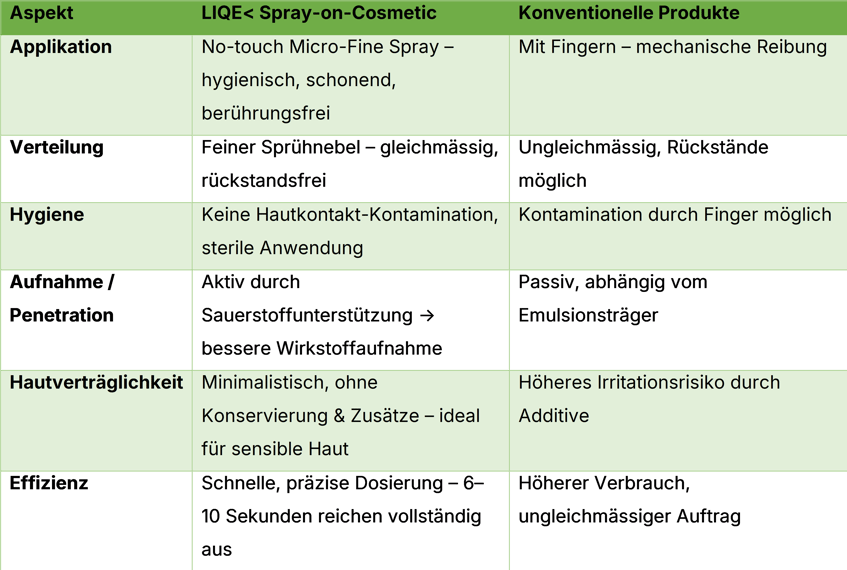 Im Gegensatz zu herkömmlichen Cremes oder Seren wird LIQE< nicht aufgetragen, sondern aufgesprüht.